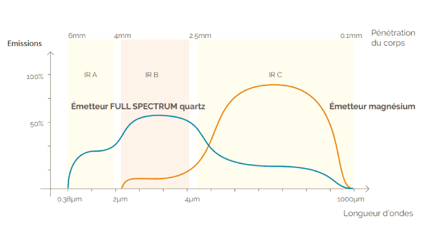 La technologie Full Spectrum intègre des panneaux infrarouge en Quartz et en Carbone, permettant de couvrir le spectre infrarouge complet pour un maximum de bienfaits. La chaleur se diffuse de façon agréable et homogène, grâce à une disposition optimale des panneaux sur les parois, le sol et les bancs de la cabine.