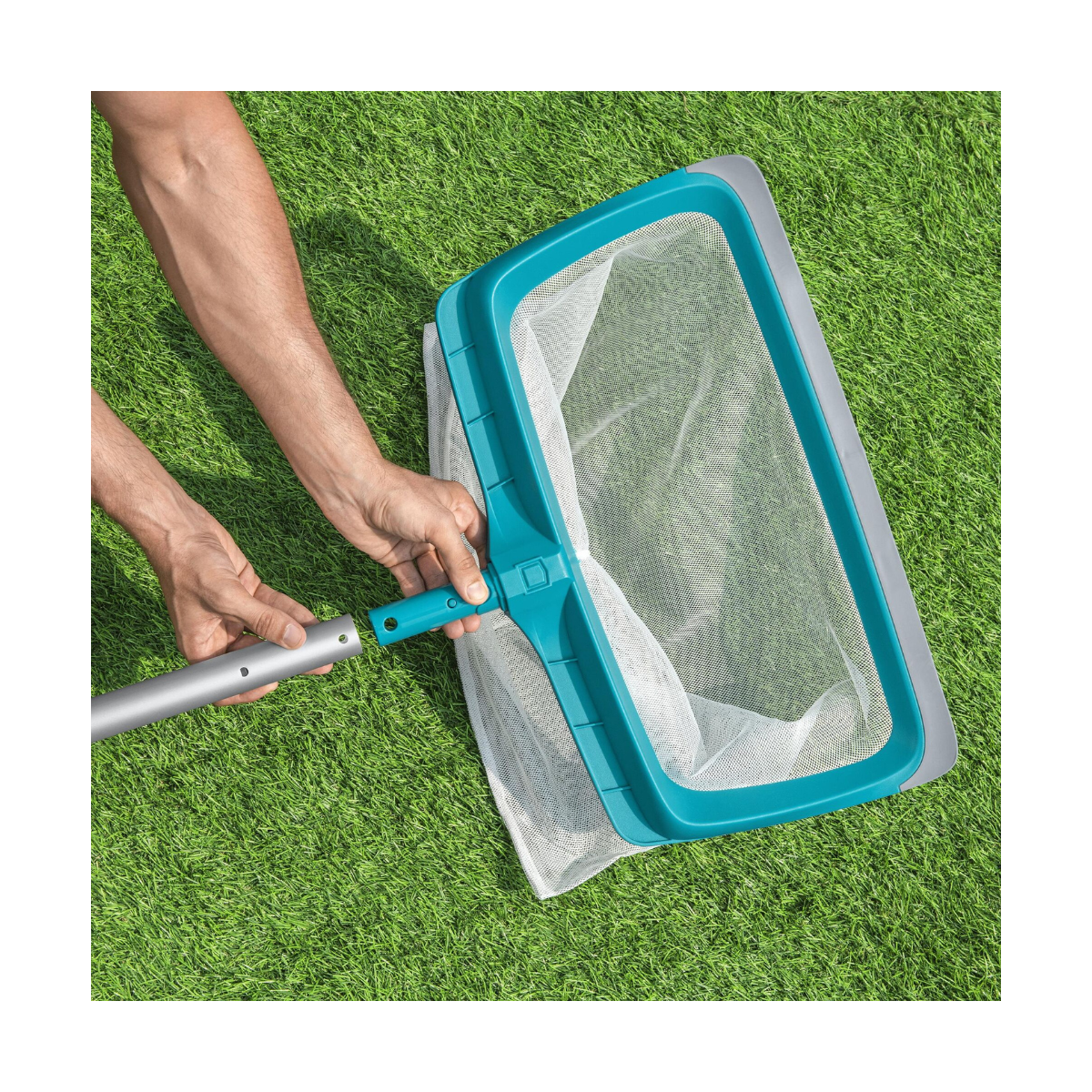 L'épuisette est compatible avec les manches de 30 mm de diamètre intérieur, un standard courant, ce qui la rend adaptable à la plupart des perches télescopiques disponibles sur le marché. Son système de fixation sécurisé garantit un maintien stable lors de l'utilisation, évitant tout risque de déconnexion pendant le nettoyage.
