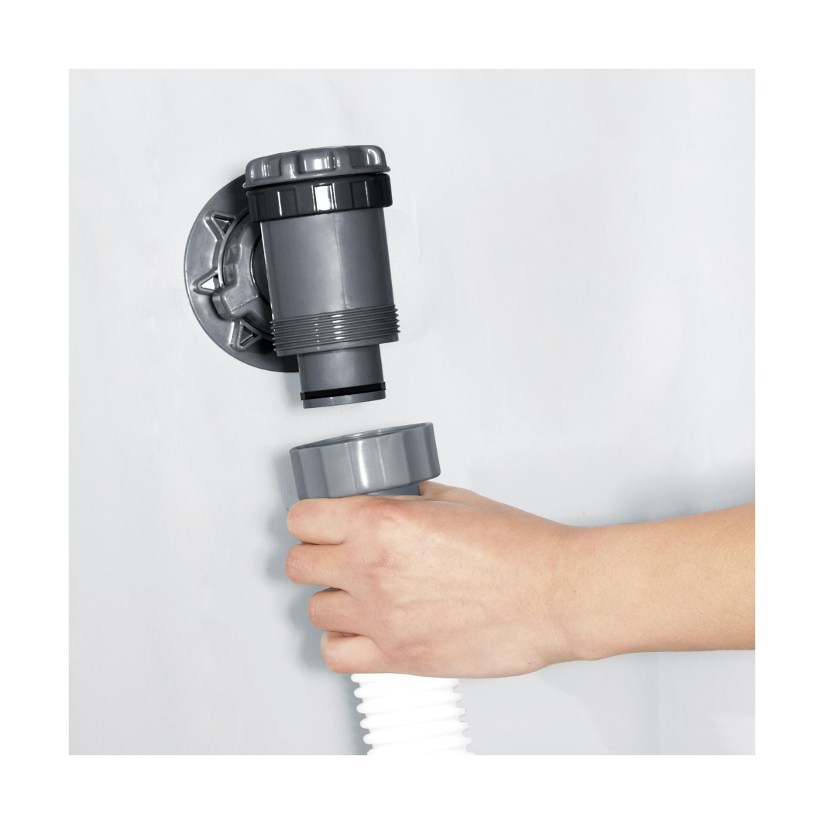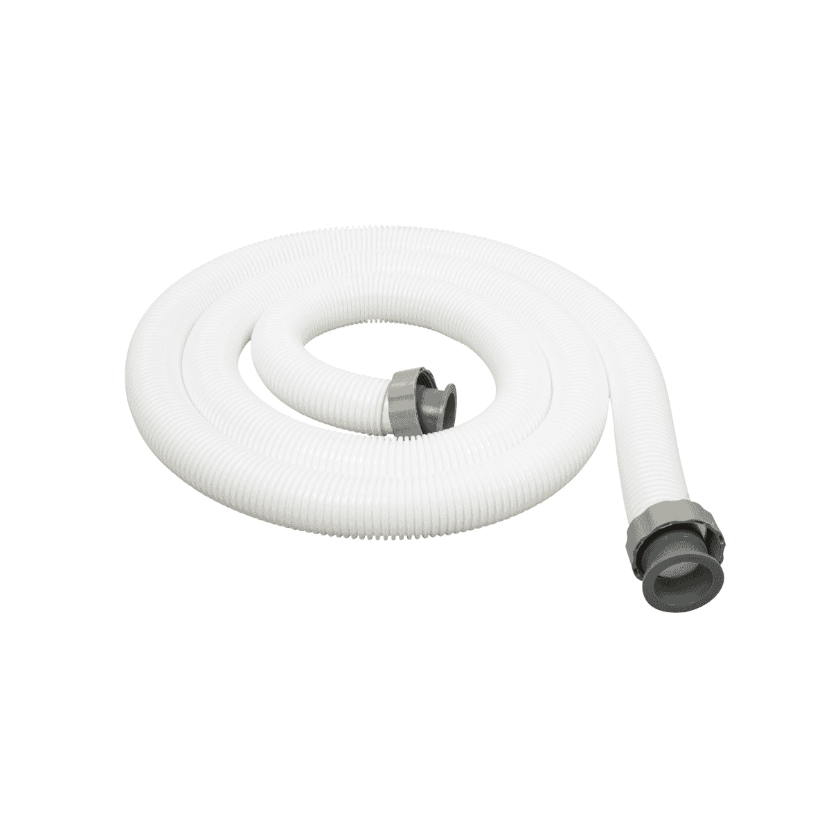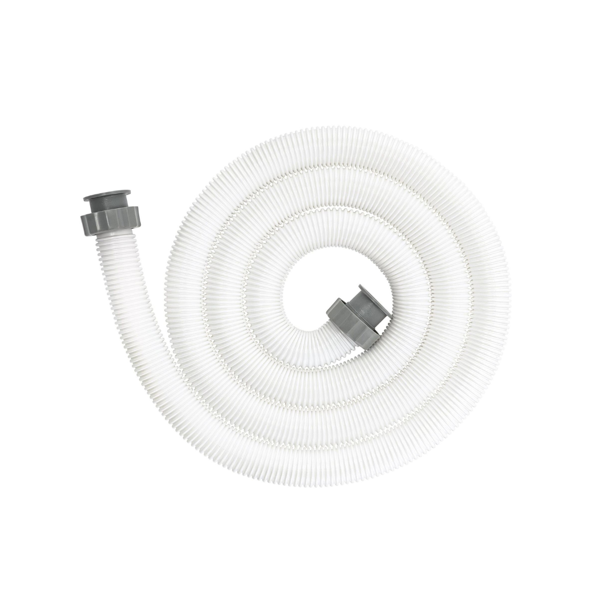 Ce tuyau est équipé de connecteurs filetés gris aux deux extrémités, conçus pour être compatibles avec les raccords de 38 mm des pompes à filtre et filtres à sable.