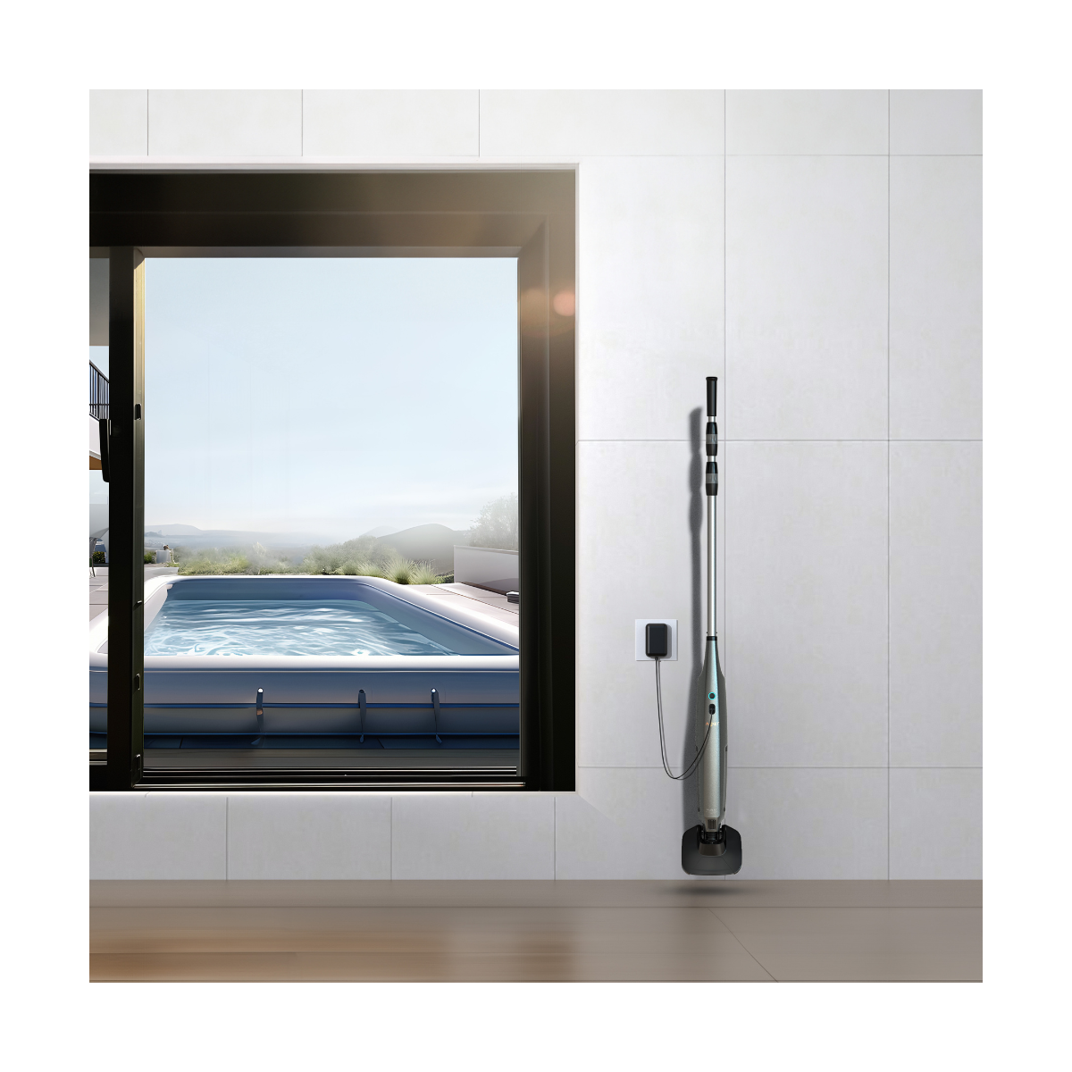Le bac à débris se retire facilement pour une vidange propre et rapide. Aucune manipulation complexe, aucun sac à remplacer. Un support mural est fourni pour ranger l’aspirateur et ses accessoires de façon ordonnée, à proximité de la piscine.