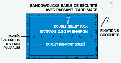 - Fixation par sandowclicks sable et fixation inox de sécurité