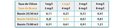 Pour calculer la quantité nécessaire d'AQUAcouleur Premio à verser dans votre bassin, il suffit de vous reporter au tableau suivant :