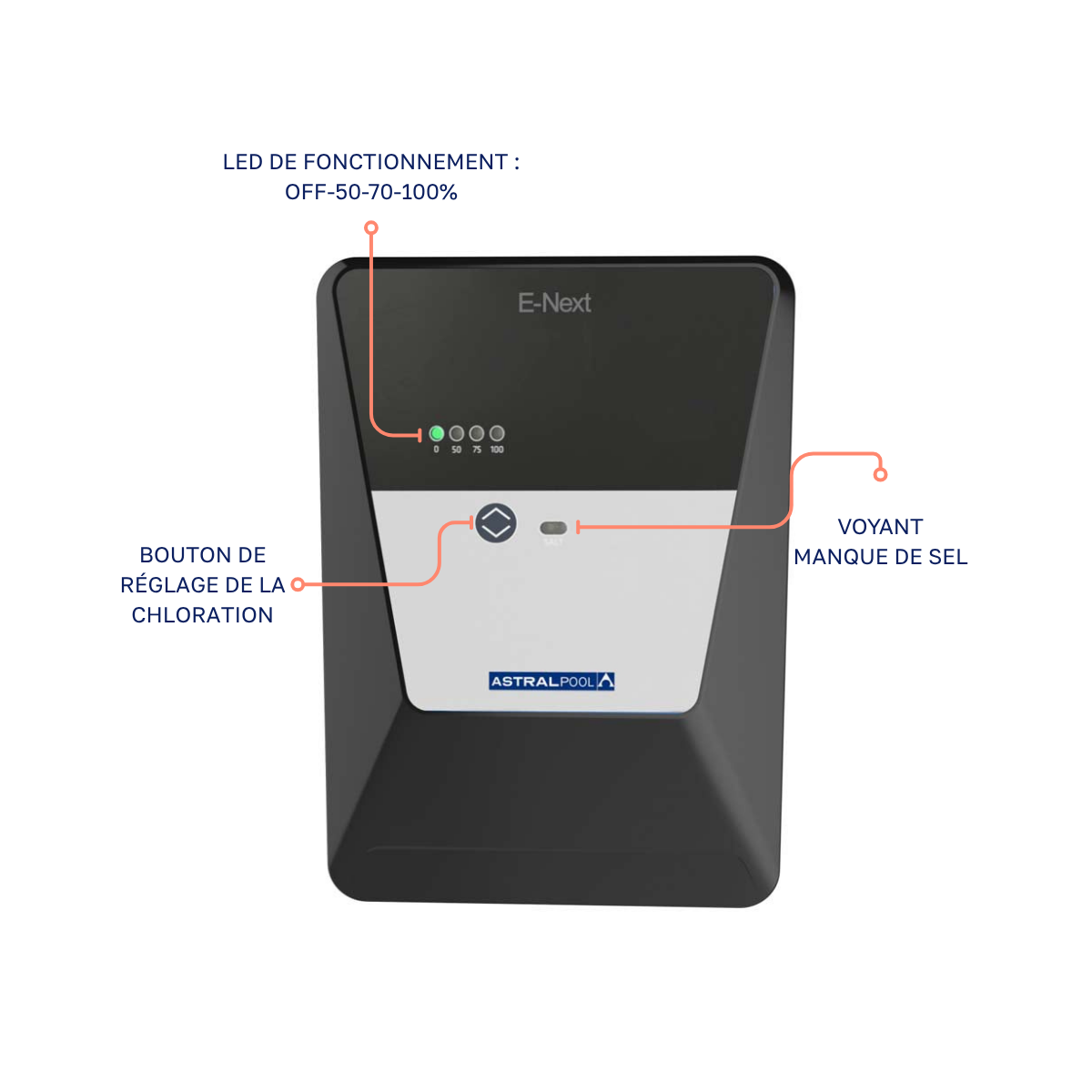 L’électrolyseur AstralPool E-Next 12 intègre plusieurs sécurités pour garantir un fonctionnement fiable. La détection de débit coupe automatiquement la production de chlore en cas de circulation d’eau insuffisante, tandis qu’une alarme de niveau de sel signale une salinité trop faible.