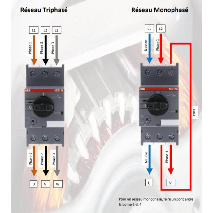 Pour une installation en monophasée, il faudra faire un pont entre les bornes 5 et 4 (voir schéma de branchement).
