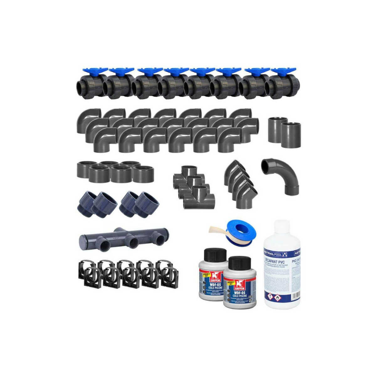 Kit de plomberie diamètre 63 mm contenant tous les raccords PVC utiles à la construction d'une piscine.
