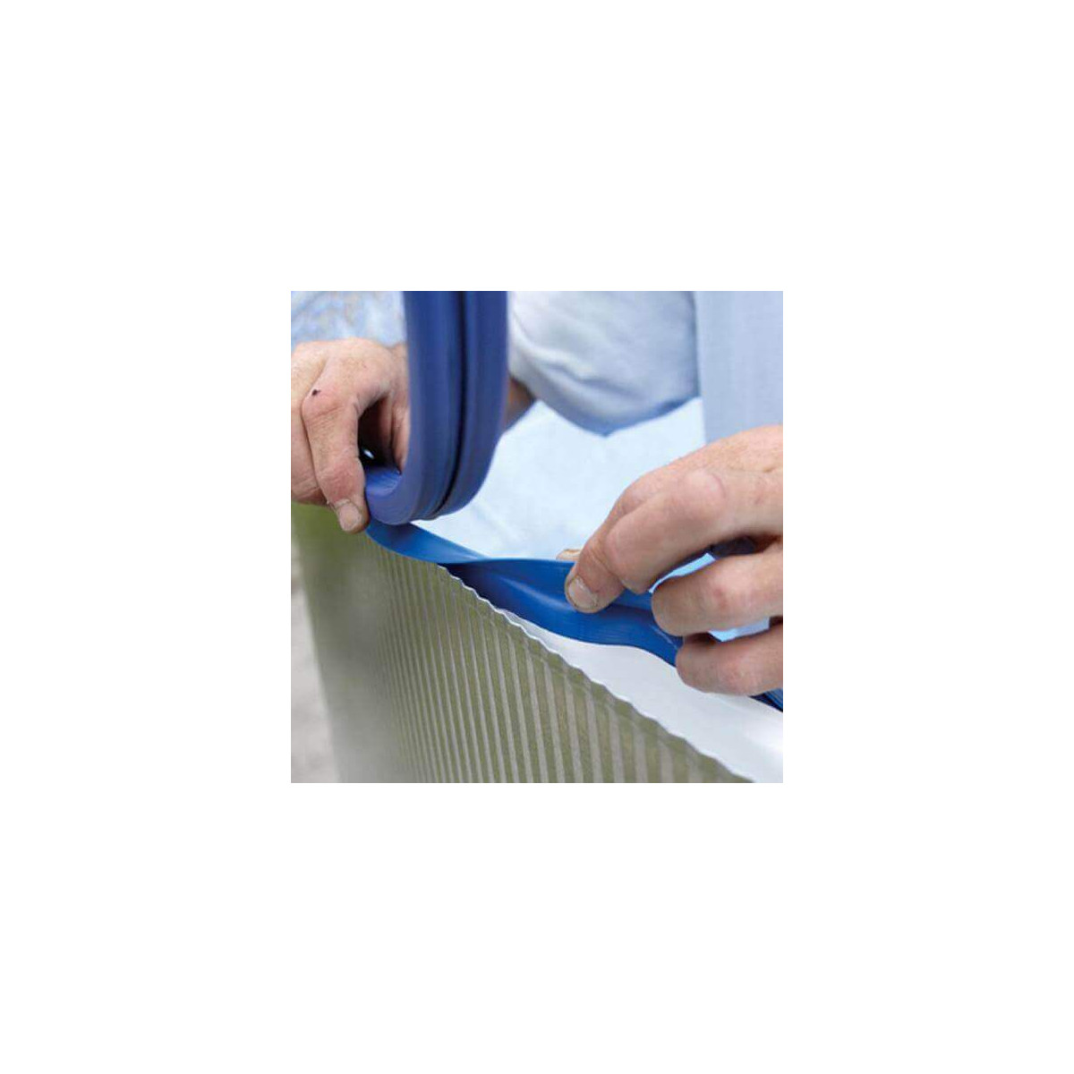 Liner avec jonc d'accrochageLe liner avec jonc d'accroche dispose d'un petit "crochet" de matière en haut qui lui permet de se placer sur le haut de la paroi avant de placer le rail d'accroche (non fourni) |