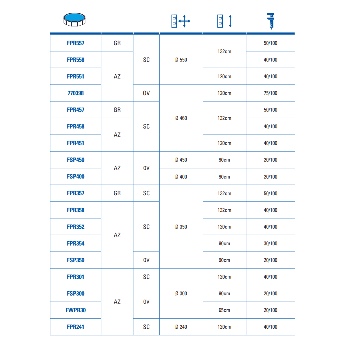 | FWPR30 | Ronde | Ø 300 cm | 65 cm | Bleu | 20/100 ème | Overlap |