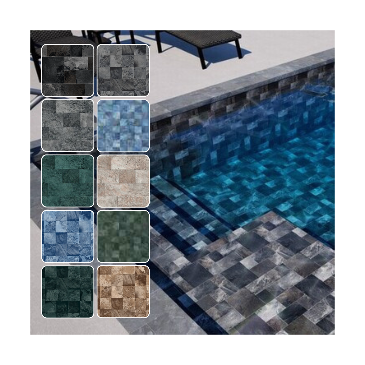 La collection Aquasense Signature propose des imprimés au rendu minéral et contemporain, incluant Brown Basalt, Fiji Vintage Grey, Fiji Brown Sand, Fiji French Coast, ainsi que les nouveautés Fiji Plus Green et Fiji Plus French Coast. D’autres imprimés sont également visibles, tels que Fiji Green, Imperial Grey, Imperial Sand et Imperial Green, offrant un large choix d’ambiances pour personnaliser le bassin.