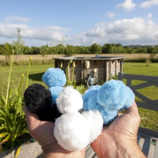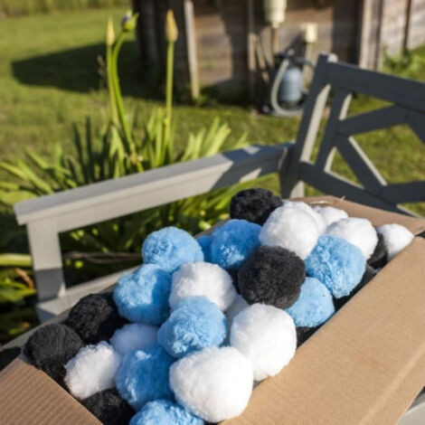 - Matériau : Billes de polyéthylène recyclable (bleu, noir, blanc)