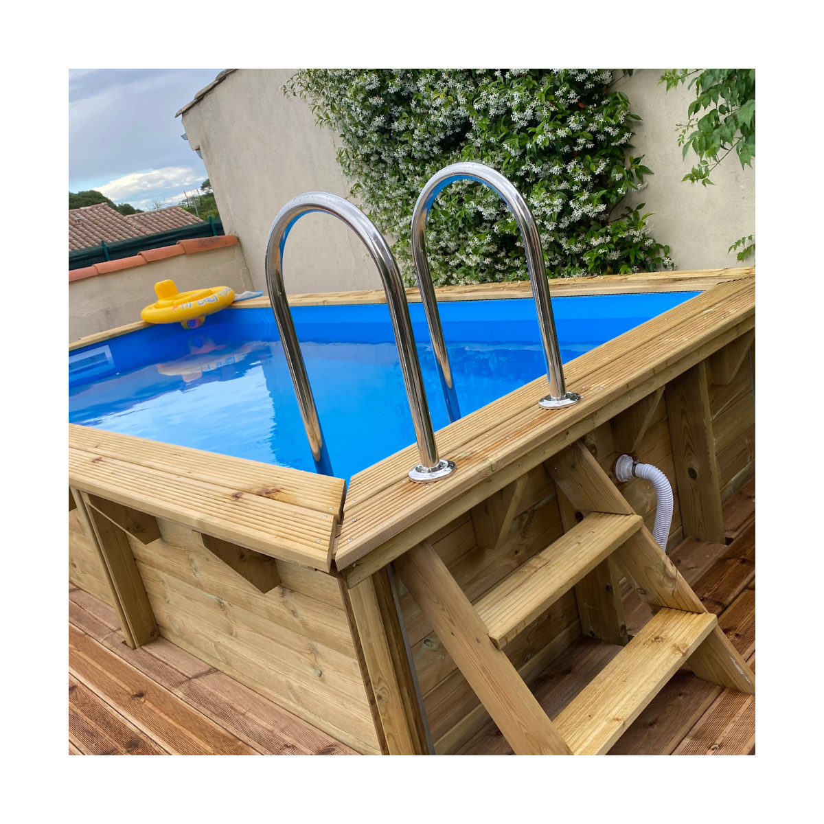 - Échelle amovible en bois et inox, garantissant sécurité et facilité d’accès.