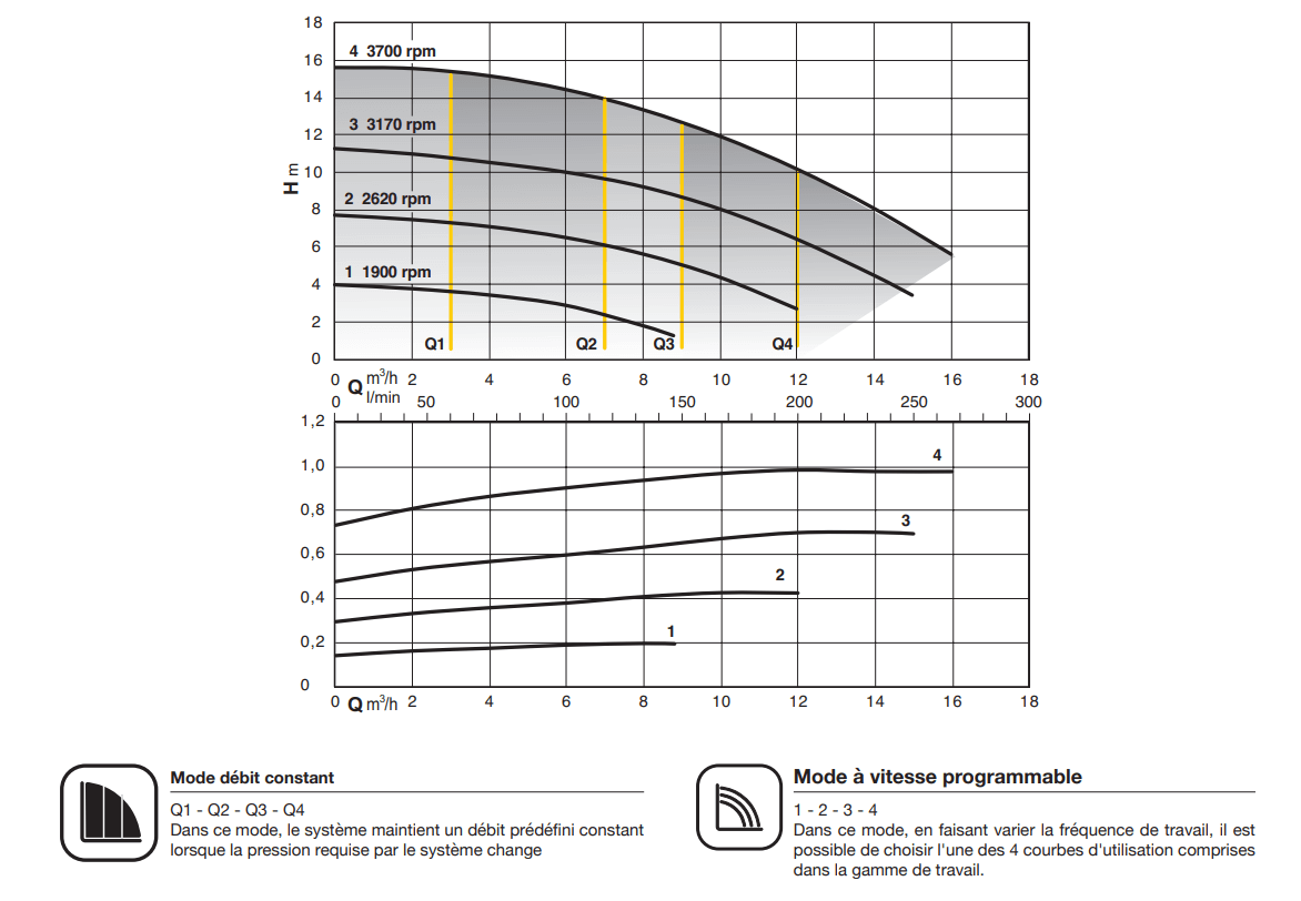 - 2 modes de fonctionnement : mode débit constant et mode à vitesse variable