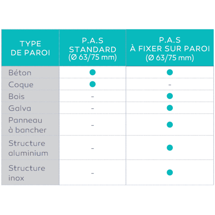- "A fixer sur paroi" : pour paroi bois, galva, panneau à bancher, structure aluminium et structure inox