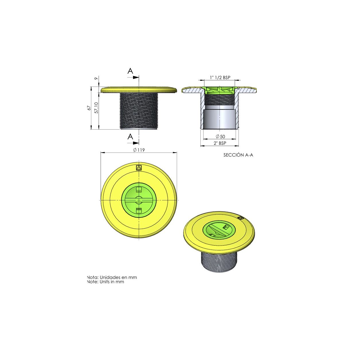 Prise balai d'aspiration Prestige pour piscine béton à visser, en ABS blanc. Connexion : filetage extérieur 2" mâle, intérieur Ø 50 mm à coller. Filetage bouchon 1"1/2. Compatible avec traversée de paroi Astral 15658/42006.