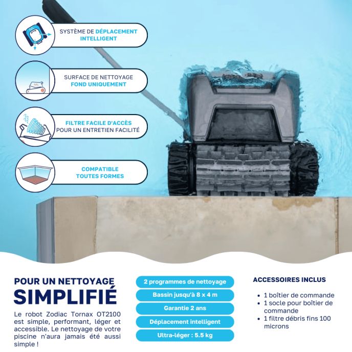 Le robot de piscine Zodiac Tornax OT2100 est un nettoyeur simple, performant, léger et accessible. Le nettoyage de votre piscine n'aura jamais été aussi simple !
