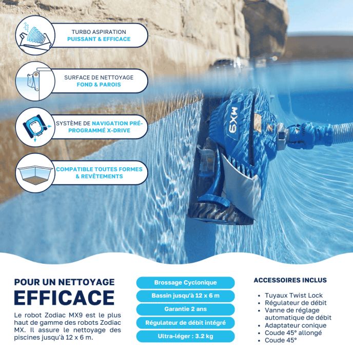 Le robot Zodiac MX9 est le plus haut de gamme des robots Zodiac MX. Il assure le nettoyage des piscines jusqu'à 12 x 6 m.