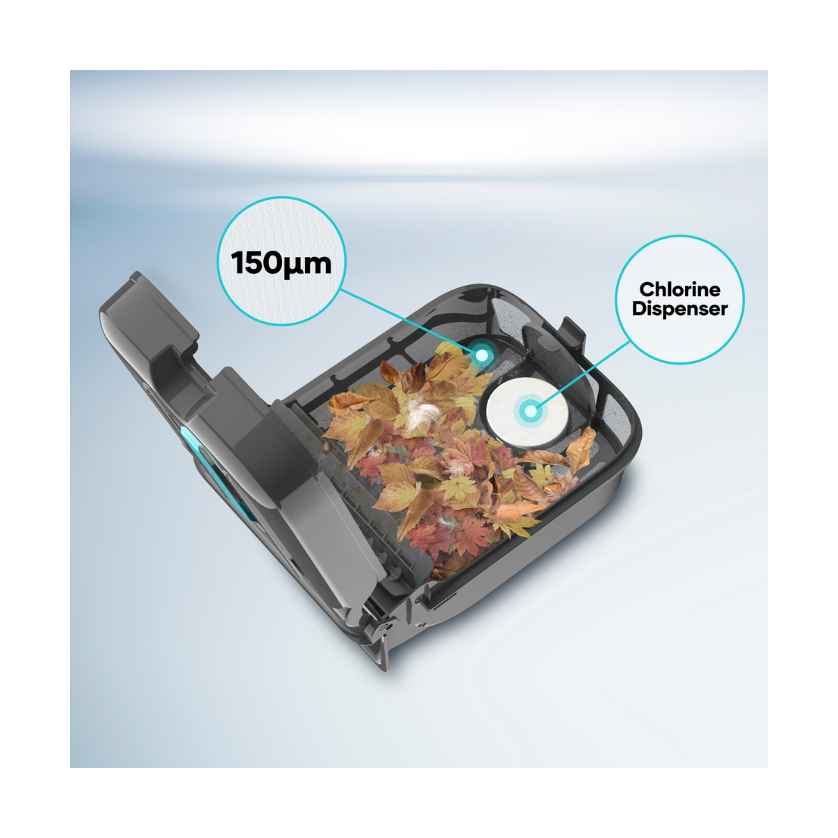 Le robot est équipé d’un distributeur de chlore intégré capable d’accueillir des pastilles de 3 pouces. Le débit est réglable afin d’adapter précisément la diffusion aux besoins du bassin. Cette fonctionnalité permet au robot ligne de flottaison de participer à la désinfection de l’eau (le robot diffuse du chlore) tout en nettoyant la surface, ce qui simplifie l’entretien quotidien de la piscine.