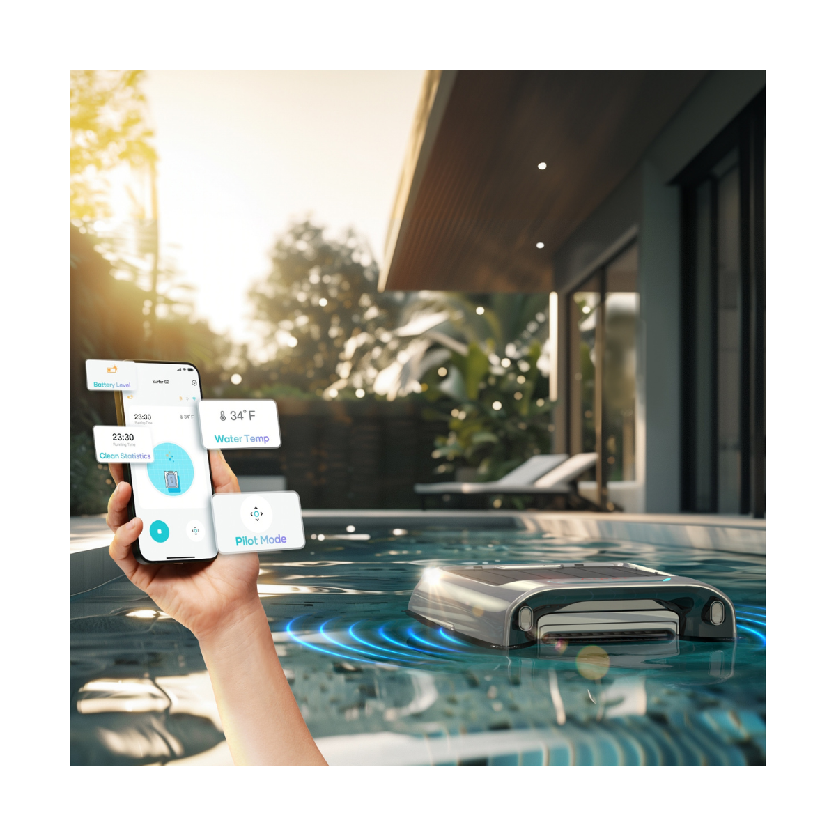 Le Robot de surface connecté Aiper Surfer S2 est compatible avec l’application mobile Aiper, qui permet un pilotage à distance en mode télécommande. L’utilisateur peut surveiller le niveau de batterie et les modes de fonctionnement en temps réel. Cette connectivité renforce le confort d’utilisation et confirme le positionnement du Surfer S2 comme un robot de surface connecté moderne et intuitif.