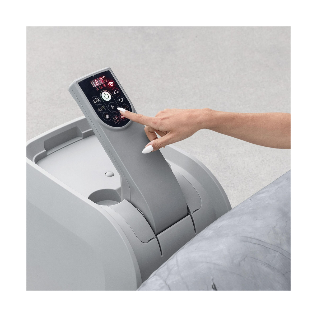 Le panneau de contrôle tactile intégré à la pompe permet de contrôler toutes les fonctions du spa tout en restant confortablement assis à l’intérieur. La pompe intègre également des porte-gobelets et un espace de rangement plat.