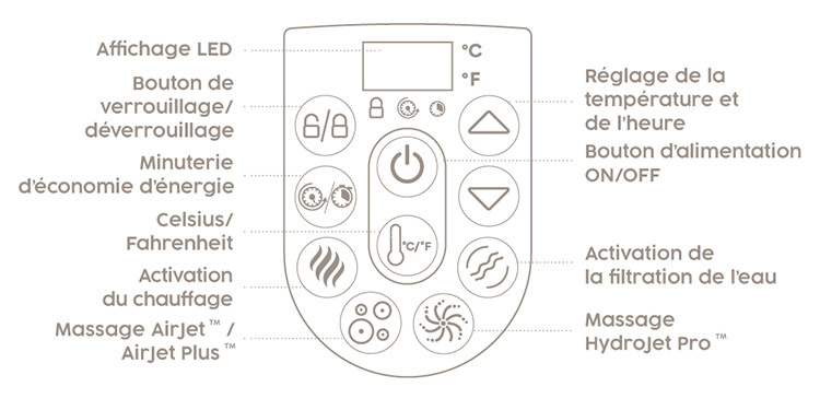 - HydroJet Pro : 180 buses massantes réparties sur le pourtour du spa afin de générer un massage doux et uniforme couplé à 10 jets hydromassants dans le dos.