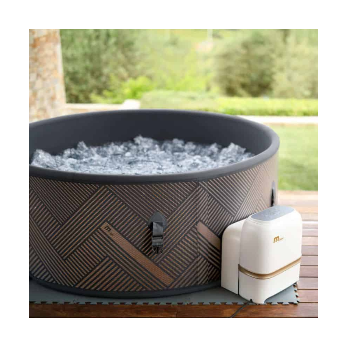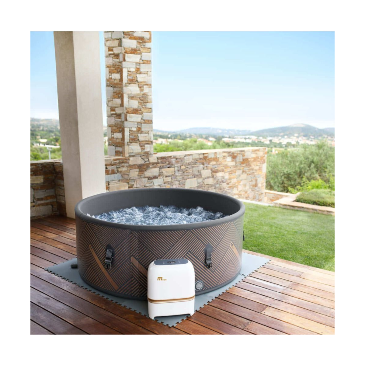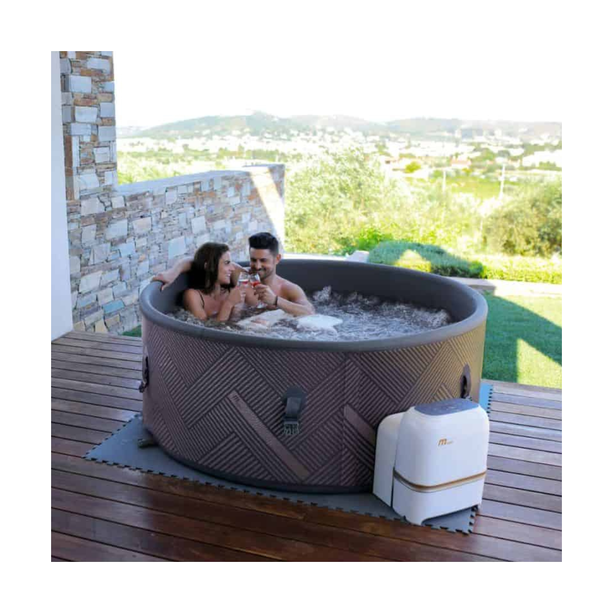 Grâce à sa conception en Drop-Stitch haute pression et sa finition gris fer, le spa Mono offre une excellente stabilité et un rendu esthétique premium. Sa structure robuste garantit une tenue parfaite dans le temps, comparable à celle d’un spa rigide.