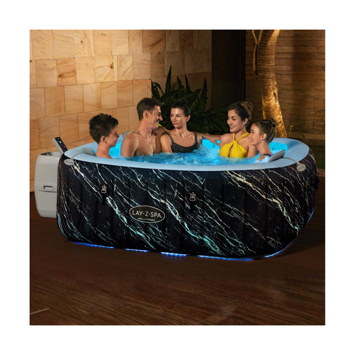 Le Lay-Z Hollywood AirJet 4 à 6 places se distingue par son liner semi-transparent rétroéclairé et sa bande LED à 7 couleurs.