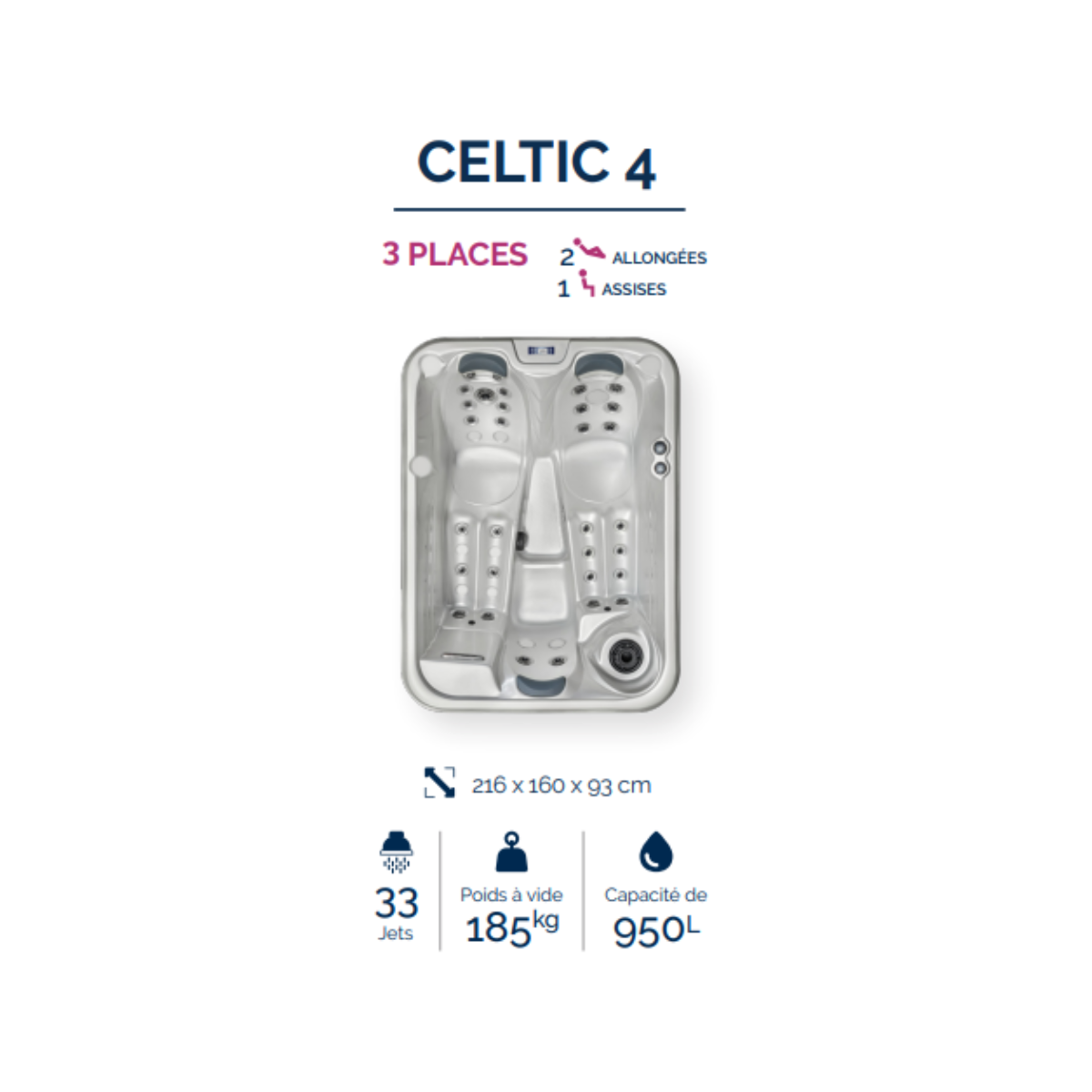 Le spa rigide Celtic 4 est conçu pour offrir un maximum de détente dans un format compact. Avec ses dimensions de 216 × 160 × 93 cm et son volume de 950 L, il s’installe facilement comme spa extérieur sur une terrasse ou dans un jardin. Ses 2 places allongées permettent une immersion complète, tandis que la place assise apporte un confort plus dynamique. Un véritable spa jacuzzi à domicile.