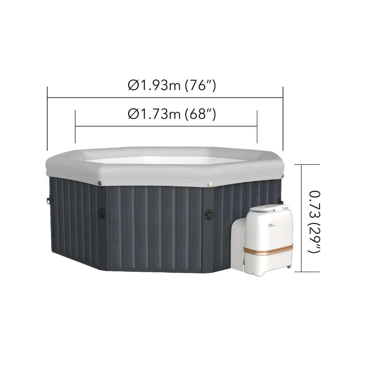 Le spa rigide Tuscany MSpa présente une forme octogonale offrant un excellent compromis entre espace intérieur et encombrement extérieur. Il affiche un diamètre extérieur de 1,93 m pour un diamètre intérieur de 1,73 m, avec une hauteur de 73 cm.