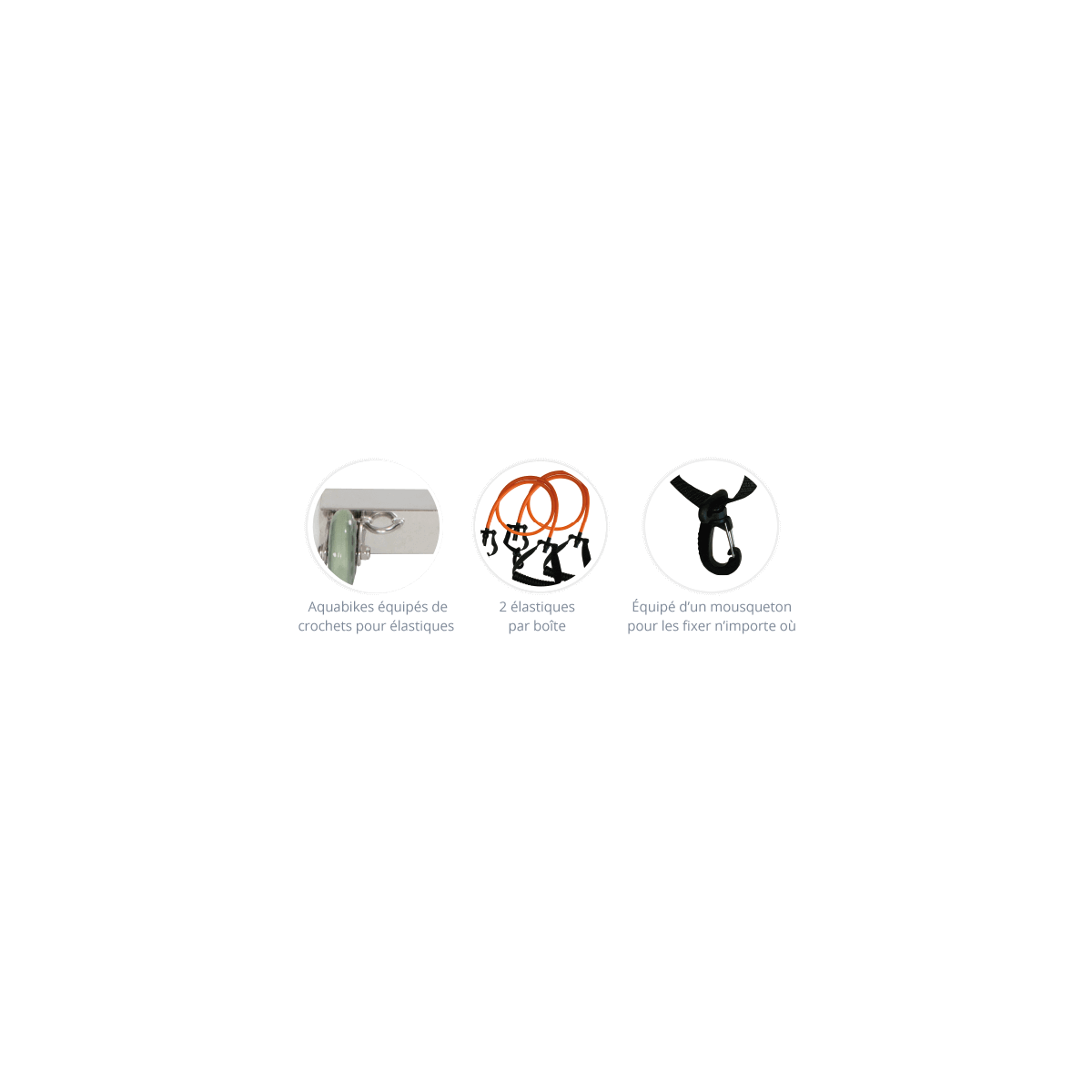 Lot de 2 élastiques aquatiques Verts à résistance Modérée (également disponibles en résistance Facile ou Intense). Conçus pour la pratique de l'aquagym à domicile ou en cours collectifs. Astuce pratique : les aquabikes de marque Waterflex disposent d'un crochet spéciale pour attacher facilement les mousquetons des élastiques.